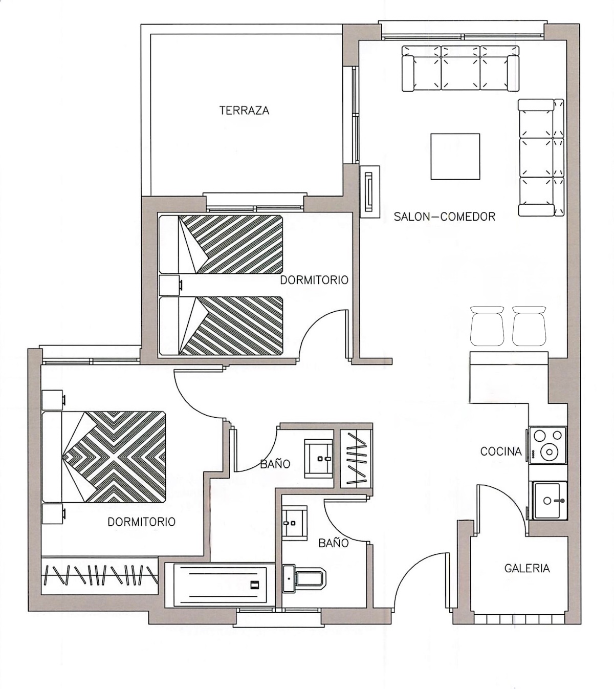 Binnen vind je een heldere leefruimte met toegang tot het terras en een moderne open keuken. Het appartement telt 2 slaapkamers en 1 badkamer met douche, plus een afzonderlijk toilet. Eén slaapkamer beschikt over een inbouwkast.